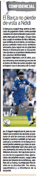 Barcelona have identified Leicester City’s Wilfred Ndidi as a target, according to a ‘confidential’ report from today’s edition of Catalan newspaper Sport.